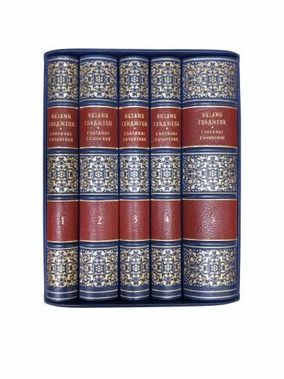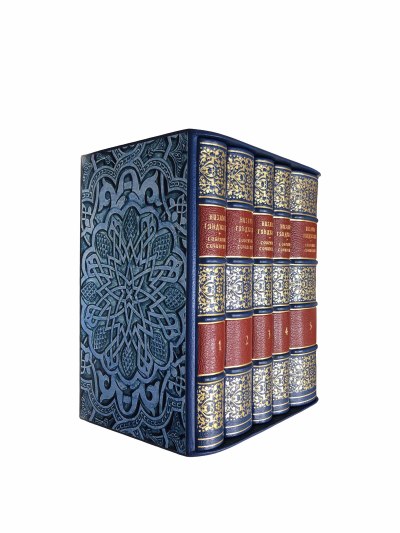 Каждый том в цельнокожаном переплете ручной работы с тиснением золотом и серебром. Иллюстрированные узорные форзацы и обрезы. Подарочный футляр.