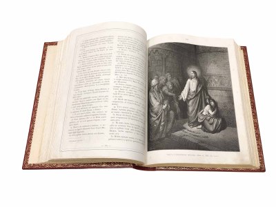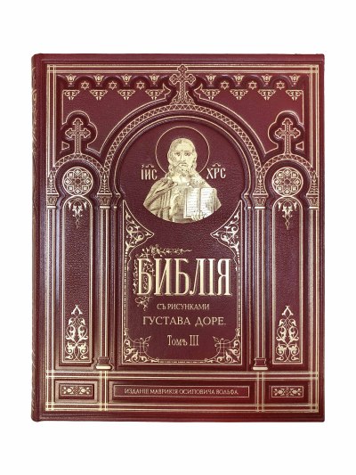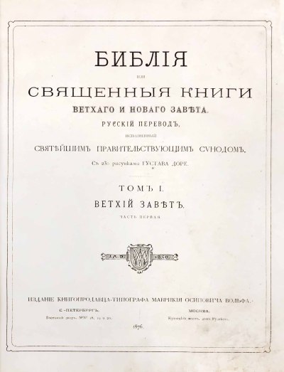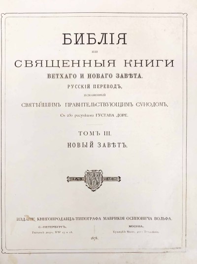 Лучшее издание «Ветхого и Нового Завета» выполненное в России в XIX веке! Библия была издана в ограниченном количестве экземпляров и практически сразу же была раскуплена. Она стала библиографической редкостью, тем более, что клише после изготовления гравюр были уничтожены.