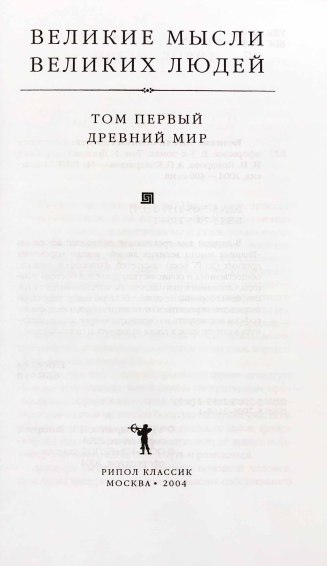 В первый том трехтомной антологии афоризма «Великие мысли великих людей» вошли изречения древних (до IV века) писателей, философов, ученых, общественных и политических деятелей Востока и Запада.