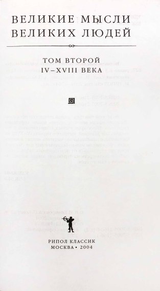Во второй том трехтомной антологии афоризма «Великие мысли великих людей» вошли изречения писателей, философов, ученых, общественных и политических деятелей, живших в период IV-XVIII вв.