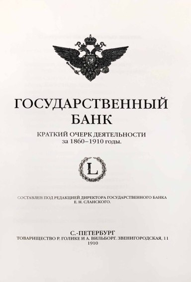 Роскошное подарочное издание, посвященное деятельности Государственного банка за полстолетия, а именно: с момента его основания в 1860 году по 1910 год. До революции именно Государственный банк выполнял функции современного Центробанка: был главным «регулятором» и основным эмиссионным центром страны. Государственный банк, просуществовавший вплоть до 1917 года, был учрежден в системе Министерства финансов. Начал функционировать 1 июля 1860 года.