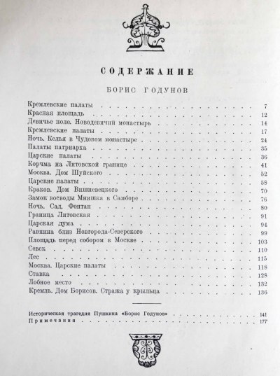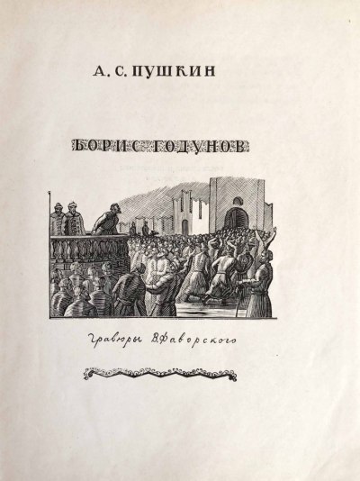 «Борис Годунов» — историческая драма Александра Сергеевича Пушкина, созданная в 1825 во время ссылки в Михайловское. Написана под влиянием чтения «Истории государства Российского» и посвящена периоду царствования Бориса Годунова с 1598 года по 1605 год и вторжению Лжедмитрия I. Иллюстрировал книгу В. Фаворский. Творчество Фаворского — одна из вершин искусства XX века. Художник был одним из европейских мастеров ксилографии, после почти трехсотлетнего упадка снова поднявших эту технику на уровень большого искусства.