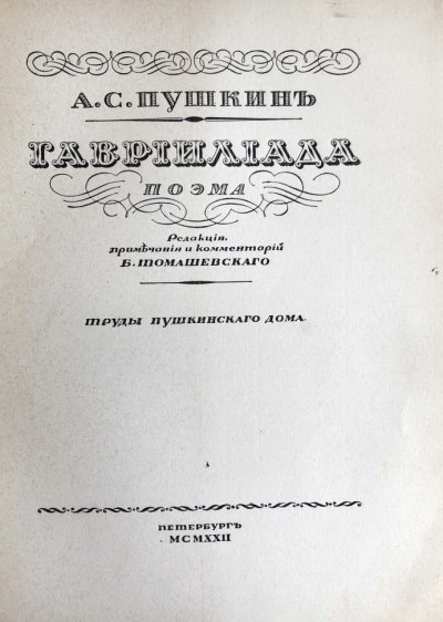Очень редкое издание, в котором впервые был опубликован полный текст «Гаврилиады» А. С. Пушкина. Прежде она ни разу не появлялась полностью на страницах вышедших в России собраний сочинений великого писателя. Первая публикация произведения датируется 1861 г., в «Русской потаенной литературе», лондонском сборнике Н. Огарева. Далее последовало еще несколько публикаций за рубежом, однако внимание к исправности текста в них оставляло желать лучшего. Как указано в предисловии издателей, книга предназначена исключительно для узкого круга тех, кто погружен в изучение творчества Пушкина.