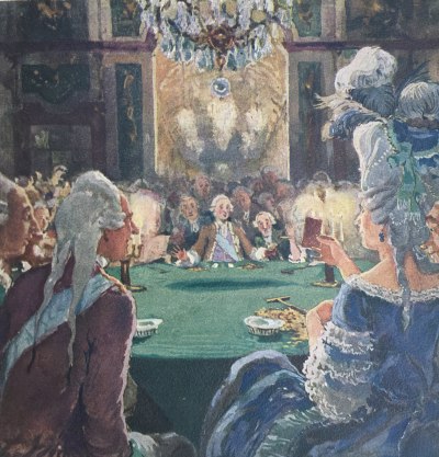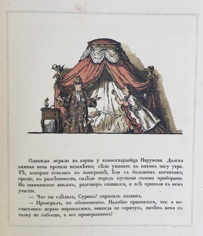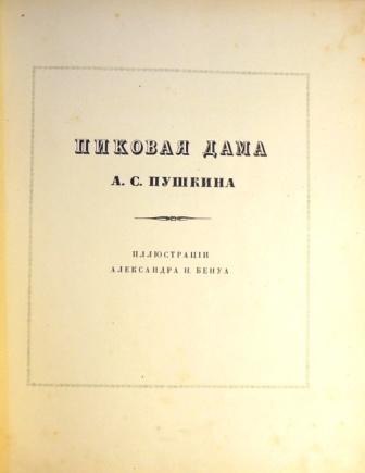 Одно из самых лучших и красивых изданий «Пиковой Дамы» с великолепными иллюстрациями Александра Бенуа. Печать на высококачественной бумаге верже с цветными иллюстрациями-вклейками на отдельных листах из плотной бумаги и многочисленными цветными иллюстрациями в тексте.
