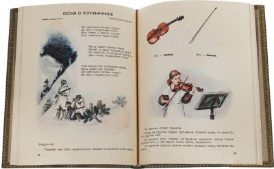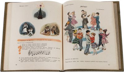 Букварь по пению. Учебное пособие для учащихся 2 класса. Тексты детских песен, ноты, множество цветных иллюстраций художников М. Н. Бутровой, И. В. Вальтер, П. М. Кондратьева, Л. И. Коростышевского, Н. А. Носкович, В.И. Чижкова. Обложка, титул и шмуцтитул художника И. А. Михранянц.