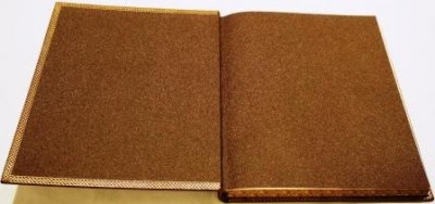 В цельнокожаном переплете ручной работы с тиснением золотом и иллюстрацией на передней крышке.