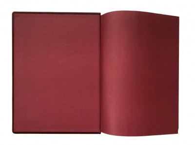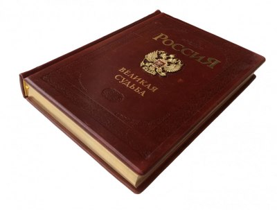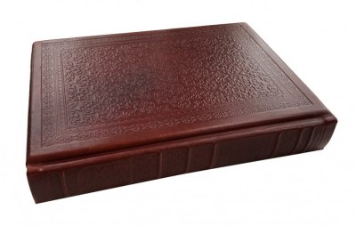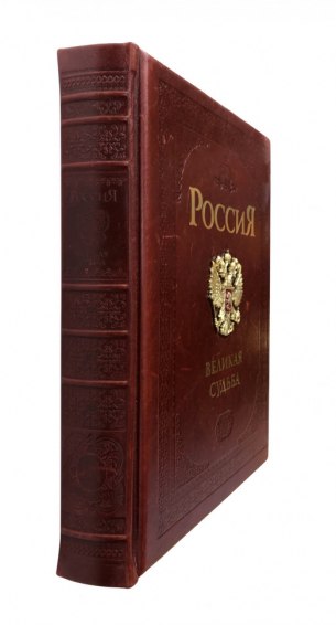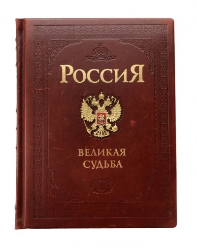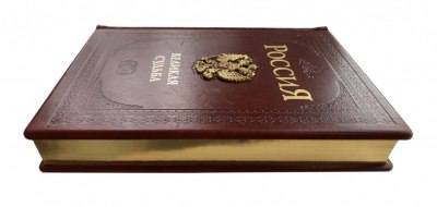 В цельнокожаном переплете ручной работы. Золотое тиснение. Трехсторонний золотой обрез. Накладной элемент — герб России (художественное литье, эмаль).