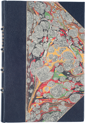В составном переплете ручной работы. Крышки оклеены «мраморной» бумагой. Корешок и углы из черной кожи.