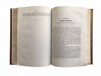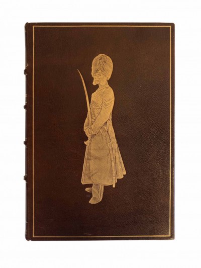 Книга в цельнокожаном переплете ручной работы с золотым тиснением на передней крышке и корешке. Шелковые форзацы.