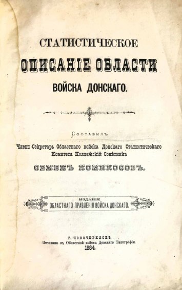 "Статистическое описание Области Войска Донского" — это фундаментальный труд, обширное описание войска Донского, в котором рассказывается об истории, народонаселении, быте донского края, самоуправлении в станицах и управлении краем, донском земстве и пр.