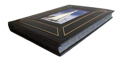 В синем цельнокожаном переплете ручной работы с тиснением золотом и иллюстрацией на передней крышке. «Мраморный» обрез. Синее тонкое шелковое ляссе.