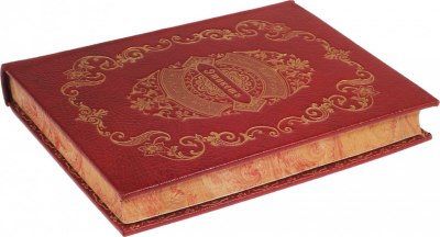 В современном цельнокожаном переплете ручной работы с тиснением золотом.