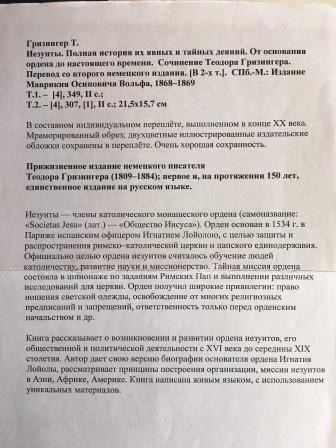 Книга Теодора Гризингера рассказывает о возникновении и развитии ордена иезуитов, его общественной и политической деятельности с 16 века до середины 19 столетия. Автор дает свою версию биографии основателя ордена Игнатия Лайолы, рассматривает принципы построения организации, миссии иезуитов в Азии, Африке, Америке. Написанная живым языком с использованием уникальных материалов, она несомненно вызовет интерес как у профессиональных историков и религиоведов, так и у всех интересующихся тайными обществами в мировой истории.