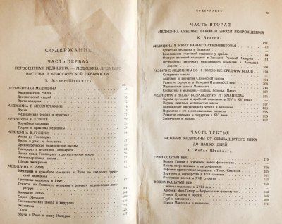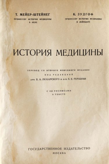 Из предисловия к русскому изданию: "Предлагаемая вниманию русского читателя книга Т. Мейер Штейнега и К. Зудгофа в сжатом, но достаточно полном очерке излагает судьбы медицины на протяжении веков, давая тот минимум сведений, который является обязательным для каждого образованного врача. Достоинством книги является обилие рисунков, прекрасно иллюстрирующих различные моменты в истории развития врачебного искусства. Недостаток — отсутствие данных о роли русской медицины в мировой ее истории, лишь два русских имени нашли место в книге."