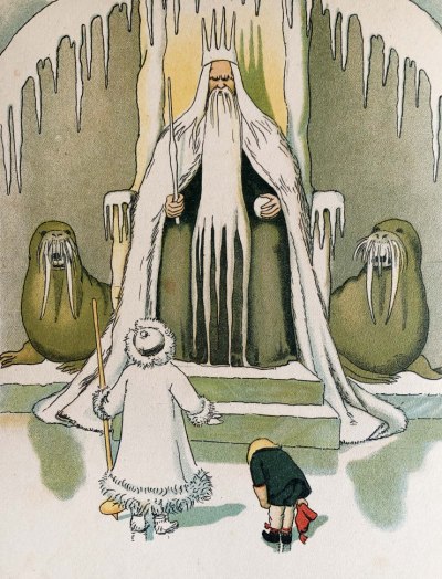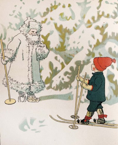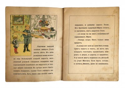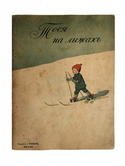 "Скучною хмурой осенью минуло Тосе шесть лет. В день рожденья мама испекла ему большущий сладкий пирог, весь облитый розовой глазурью; ему подарили хорошенький кораблик на парусах и теплые зимние сапожки. Но лучше всего был папин подарок — чудесные лыжи! Тося сейчас же схватил их, — легки, как перышко, и длиннее самого Тоси!.. Кудрявый братишка Юрка стоял и смотрел, как Тося радуется.