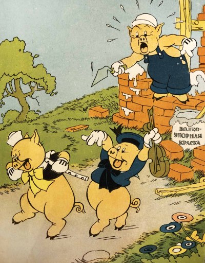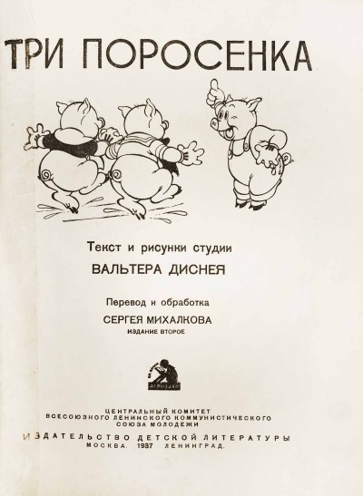 Впервые сказка «Три поросенка» была напечатана в «Пионерской правде» (1936, 16 апреля), а позже вышла отдельным изданием с подзаголовком: «Текст и рисунки студии Вальтера Диснея. Перевод и обработка Сергея Михалкова». Книга была проиллюстрирована кадрами мультфильма студии Диснея, который был показан на Московском кинофестивале в 1936 году, где получил приз. В дальнейшем заголовок сказки видоизменялся: «Американская сказка в пересказе Михалкова», «Английская народная сказка в пересказе Михалкова» и, наконец, «Сергей Михалков “Три поросенка”». Пересказ Михалкова был переведен на немецкий, а с немецкого языка — на английский, даже несмотря на то что сюжет сказки был заимствован из английского фольклора. Этот парадокс служил своего рода доказательством своеобразия и неповторимости михалковского варианта сказки. Книга выдержала более 20 изданий. По мотивам сказки автором была написана пьеса «Три поросенка и серый волк». Что примечательно, диснеевский мультфильм «Три поросенка» был снят не только для детей, но и для взрослых. Любой американец, посмотрев его, понимал, что Умный Поросенок — это президент Франклин Рузвельт, победивший Волка — Великую депрессию.