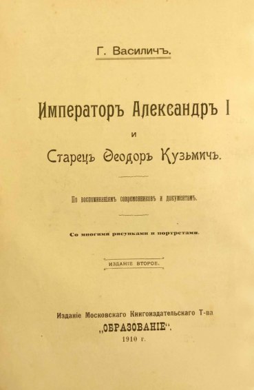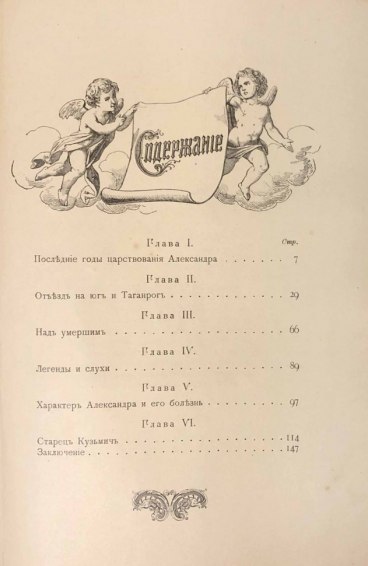 Книга написана по воспоминаниям современников и документам, со множеством рисунков и портретов. В ней анализируется известная легенда о старце Фёдоре Кузьмиче. Согласно легенде, возникшей в середине XIX века, старец Кузьмич считается императором Александром I, инсценировавшим свою смерть и ставшим скитальцем.