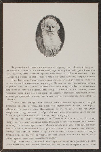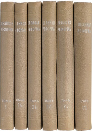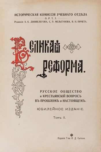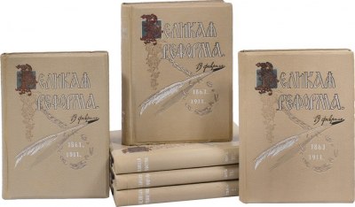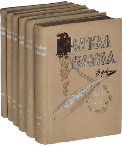 «Великая реформа» — знаменитое юбилейное энциклопедическое издание, посвященное пятидесятилетию осуществления Крестьянской реформы в России (1861–1911). «Великая реформа» была выпущена в Москве в 1910–1911 годах Исторической комиссией учебного отдела московского Общества распространения технических знаний (ОРТЗ) и Товариществом известного издателя И.Д. Сытина в виде комплекта из шести томов энциклопедического формата. Издание явилось первой научной попыткой выяснить в полном объеме историческое значение отмены крепостного права в России. В работе над статьями для «Великой реформы» приняли участие свыше 60 ученых, журналистов, писателей. Авторский коллектив не ограничивался московскими учеными, в него вошли специалисты из Санкт-Петербурга, Киева, Казани и др. городов, среди них академики: К.К. Арсеньев, А.Ф. Кони, А.С. Лаппо-Данилевский, П.Д. Боборыкин, профессора, публицисты и другие видные ученые. Для иллюстрации «Великой реформы» использовались репродукции из «Русского художественного листка» В.Ф. Тимма, «Русского архива», «Русской старины», «Исторического вестника», «Русских былей», «Русских портретов XVIII века» великого князя Михаила Николаевича, книги «Москва в ее прошлом и настоящем». Также источником для иллюстраций послужили собрания Исторического музея в Москве, Музея П.И. Щукина, Румянцевского музея, Петербургской публичной библиотеки, Этнографического музея Московского университета, Московского литературно-художественного кружка, Третьяковской галереи, частные коллекции П.Я. Дашкова, А.П. Бахрушина, графинь С.В. Паниной и В.Н. Бобринской, писателя Н.Д. Телешова и др. Многие репродукции, появившиеся в «Великой реформе», были опубликованы впервые. В заключительном шестом томе дан подробный указатель иллюстраций ко всем шести томам.