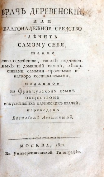 Врач деревенский, или Благонадежное средство лечить самому себя, также свое семейство, своих подчиненных и домашний скот, лекарствами самыми простыми и наскоро составляемыми. Изданное на французском языке Обществом искуснейших парижских врачей. Переведено Василием Левшиным.