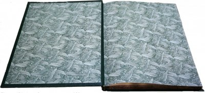 В зеленом цельнокожаном переплете ручной работы с цветной иллюстрацией на передней крышке.
