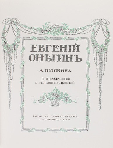 Одно из лучших изданий «Евгения Онегина» с великолепными иллюстрациями Е.Самокиш-Судковской. Изысканные акварели художницы выполнены в стиле салонного реализма, по своему замыслу их можно назвать театрально-постановочными. Рисунки Е.П.Самокиш–Судковской проникнуты романтическим и несколько сентиментальным настроением. В них проявилась авторская интерпретация пушкинского произведения, личностное понимание текста и образного ряда. Книга пользовалась большим успехом у покупателей.
