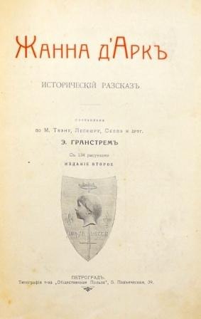 Одно из лучших довоенных изданий, посвященных Жанне д’Арк или Орлеанской деве (1412–1431), национальной героине Франции, командующей французскими войсками в Столетней войне. Попав в плен, она была осуждена как еретичка и сожжена на костре. Впоследствии была канонизирована и причислена Католической церковью к лику святых. Эдуард Андреевич Гранстрем (1843 –1918), известный петербургский издатель, составил книгу для юных читателей, по которой они могут с сочувствием проследить за подвигами молодой француженки с благородным сердцем, которая до сих пор является символом добра, мужества, справедливости и высоких идеалов рыцарства. Он ставил перед собой задачу не столько перечислить все известные исторические подробности подвигов Жанны д’Арк, сколько передать в общей сюжетной канве дух эпохи XV века, описать страницы детства Жанны, сделать образы героев понятными юным читателям. Издания для детей Гранстрема в конце XIX — начале XX в. были широко известны в России и пользовались заслуженным успехом у читающей публики. Большинство книг этого издательства было иллюстрировано оригинальными гравюрами и рисунками известных в свое время российских и зарубежных художников.В коричневом цельнокожаном переплете ручной работы с тиснением золотом и иллюстрацией на передней крышке. Коричневый тонированный обрез. Коричневое тонкое шелковое ляссе