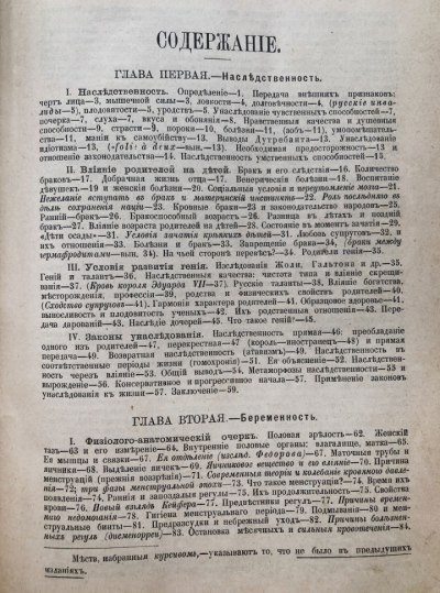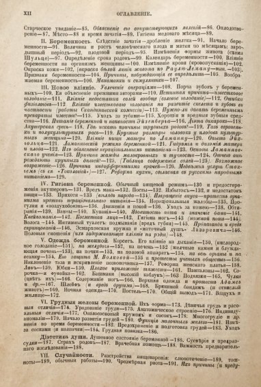 Материал расположен в разделах, логично следующих друг за другом: наследственность, беременность, жизнь утробного младенца, уход за новорожденным, уход за родильницею, одежда грудных детей, детские принадлежности, мать и кормилица, искусственное вскармливание, первые годы жизни.
