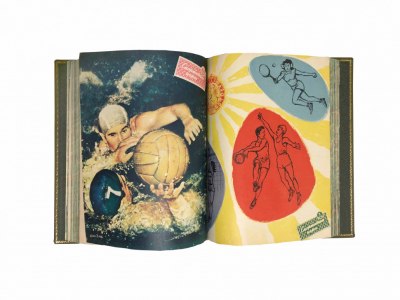Книга в цельнокожаном переплете ручной работы с тиснением золотом. Цветные иллюстрированные обложки сохранены в переплете.